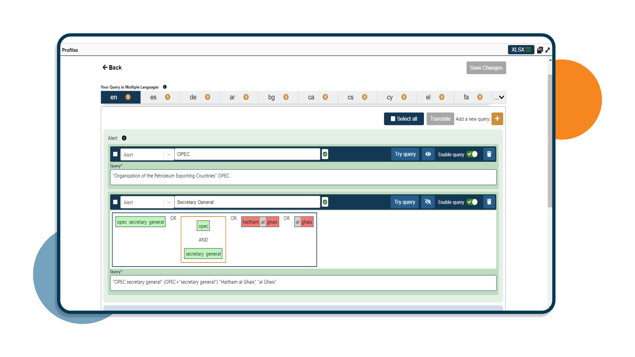 Use our Query Visualization feature, integrated into the eMM Dart platform, to write your desired search terms and find out if words are already part of the eMM vocabulary (green) or not (red). Our language models are very large, however, if you search for proper names or rare newly created terms there are chances that we can add them to our dictionary or update our language model.